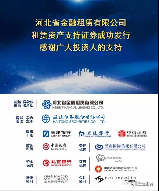 日前,河北省金融租賃有限公司(以下簡(jiǎn)稱“河北金租”)冀租穩(wěn)健2020年第一期租賃資產(chǎn)支持證券在銀行間債券市場(chǎng)成功簿記建檔發(fā)行,獲得了交通銀行、中國(guó)銀行等大型國(guó)有銀行及其他各類銀行的踴躍認(rèn)購(gòu),合計(jì)金額15.65億元。