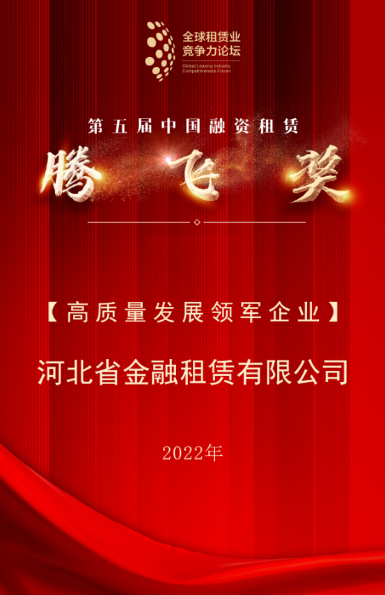日前,第九屆全球租賃業競爭力論壇年度峰會圓滿召開,河北省金融租賃有限公司(以下簡稱“河北金租公司)再度攬下中國融資租賃“騰飛獎”,榮獲“高質量發展領軍企業”榮譽。